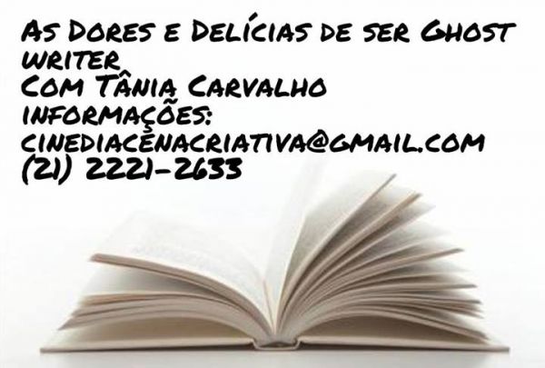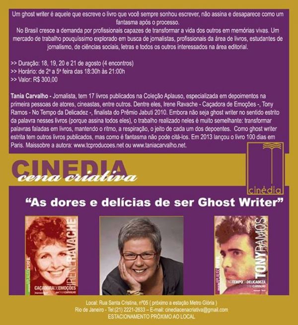 Para a jornalista Tania Carvalho, a função do ghost writer é pesquisar, entrevistar, recolher arquivos e papéis esparsos, enfim toda a memorabilia sobre o assunto e, especialmente, OUVIR o autor, porque as idéias, o jeito de se comunicar, os maneirismos são daquele que assina o livro. A Cinédia Cena Criativa apresenta novamente o curso "AS DORES E DELÍCIAS DE SER GHOST WRITER", a partir do dia 18 de agosto às 18:30h. Imperdível! Mais informações pelo e-mail cinediacenacriativa@gmail.com Valor:R$300,00.
