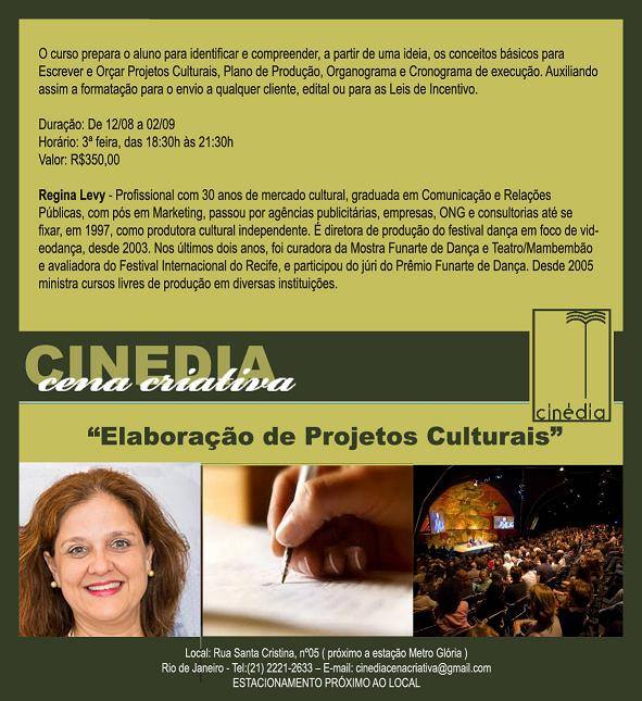 Convencer os patrocinadores e fazer com que entendam e aprovem seu projeto cultural é o objetivo do curso "Elaboração de Projetos Culturais", com Regina Levy, a partir do dia 12 de agosto, às 18h30h, na Cinédia Cena Criativa. Valor R$350,00